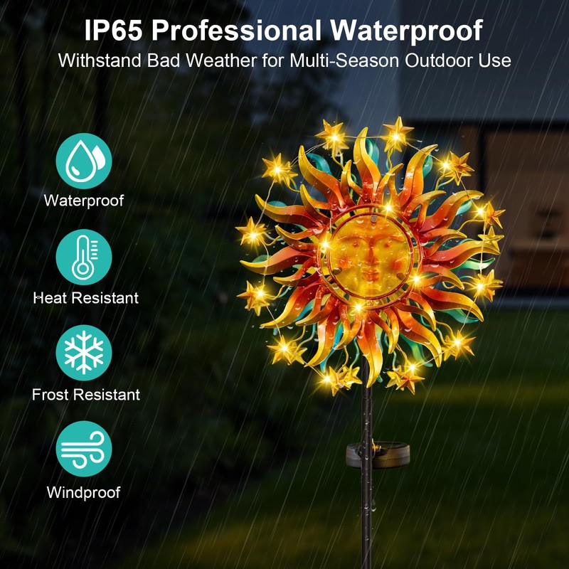 - Waterproof & Rust-ProofSun Face solar wind spinner is made of durable metal with a rust-proof coating. IP65 waterproof design makes it work well in all kinds of weather, such as lightning, rain, snow. As it spins with the breeze, shining, a bright lights on the wind spinner adds more charm to you patio.