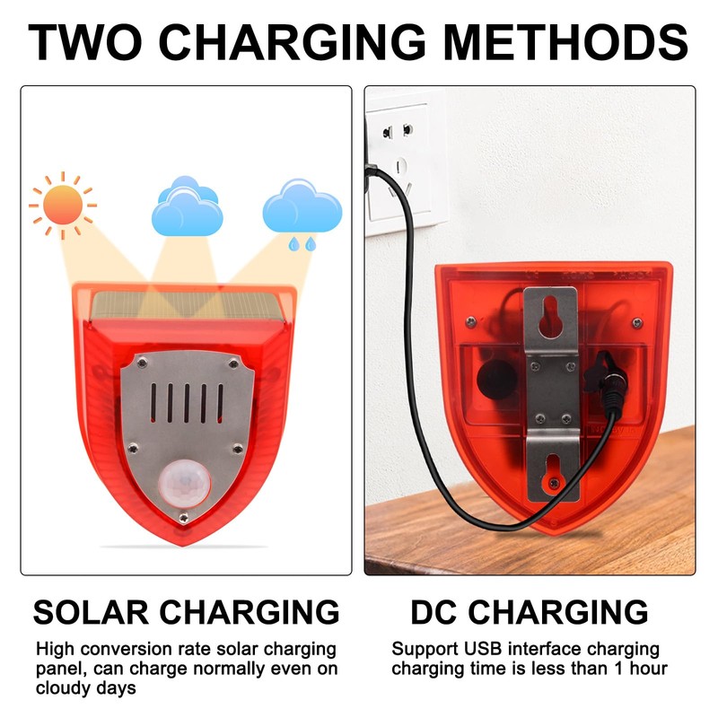 • Solar Alarm and Long Working Time: this motion detector alarm outdoor is both solar powered and DC charging, which can work for up to 8 hours after fully charged under sunshine; You can also charge it by DC power adapter for about 1 hour in rainy or cloudy days, very convenient to use