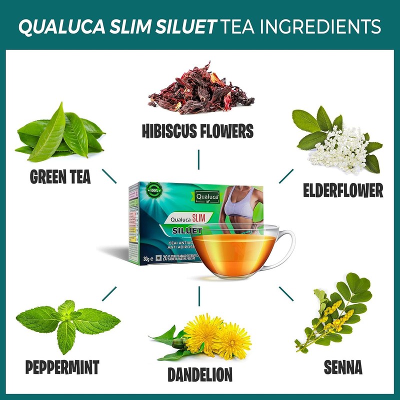 Slim Siluet Tea: Green Tea*, Hibiscus Flowers*, 🌼 Elderflowers*, 🍃 Mint Leaves*, Senna Leaves*, 🌿 Dandelion Leaves*.