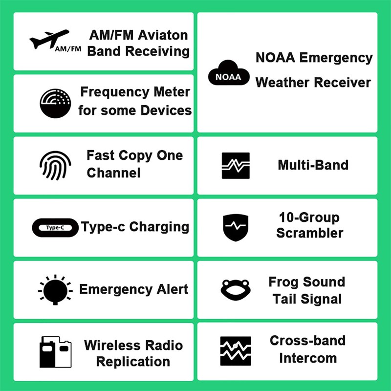 • Functions: Wide frequency range (144-148MHz 420-450MHz allows you to expand the frequency scope); Frequency copy/counter funcion; Larger display; Side mounted USB-C charging port; AM aircraft band; FM; DTMF; NOAA weather alarm etc