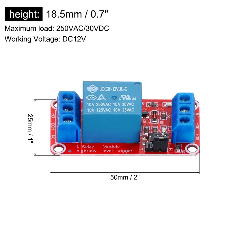 - Material: PCB; Channel: 1; Color: Red; Maximum load: 250VAC/30VDC; Quiescent current: 5mA; Working voltage: DC12V; Maximum load current: 10A; Size: 50 x 25 x 18.5 mm (L x W x H); Package contents: 1 piece x relay module