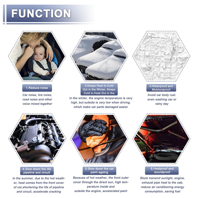 • Heat Shield Design The surface is made of foam. Heat resistant. Blocks the transfer of sunlight, engine and exhaust pipe heat into the cabin, reduces air conditioning energy consumption and saves fuel. Keeps your car cooler in summer and warmer in winter.