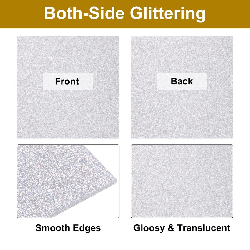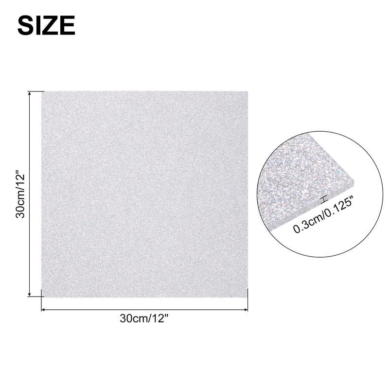 - Length x Width x Thickness: 12 x 12 x 0.125 inches / 30 x 30 x 0.3 cm; Finish: Glitter; Color: Silver; In the packaging: 1 piece acrylic sheets;