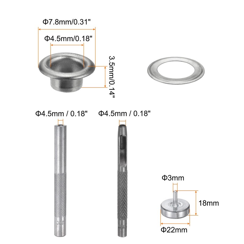 • Size - Eyelet Size: 7.8 x 4.5 x 3.5mm / 0.31" x 0.18" x 0.14" (OD*ID*H), Hole Punch Diameter: 4.5mm / 0.18".