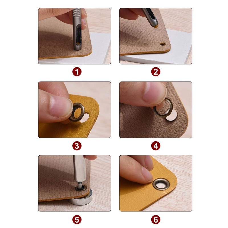• Steps of use: first use a hole punch to punch the hole, insert the hole through the eyelet and install the washer. Then use the installation pin and base to tighten the eyelet.