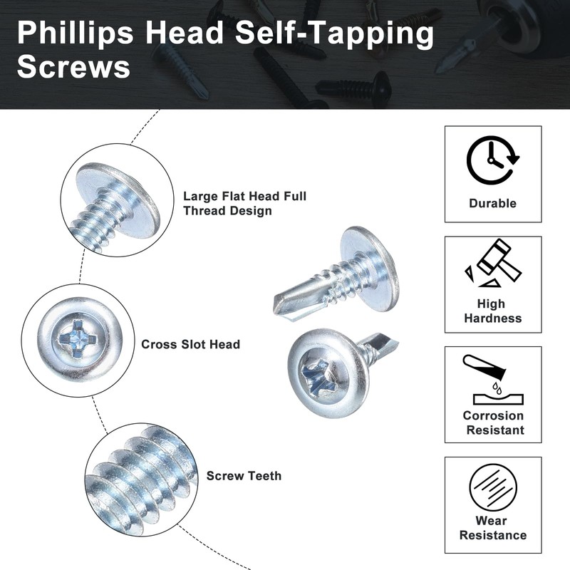 Material - Diese Kreuzschlitz-Selbstbohr- und -schneidschrauben bestehen aus Kohlenstoffstahl mit einer weißen Zinkbeschichtung auf der Oberfläche, die eine hohe Härte aufweist, nicht leicht zu rosten oder zu verformen ist, korrosionsbeständig ist, eine hervorragende Verschleißfestigkeit aufweist und langlebig ist.