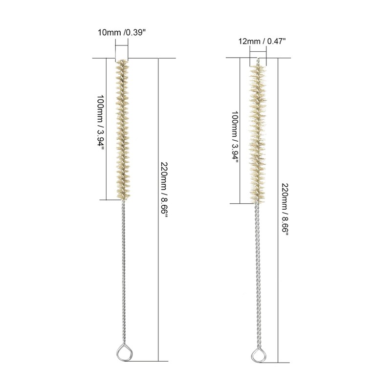 - Bristle Material: Synthetic Bristles; Brush Size: 100 x 10 mm / 3.94 x 0.39 inches (L x D), 100 x 12 mm / 3.94 x 0.47 inches (L x D)