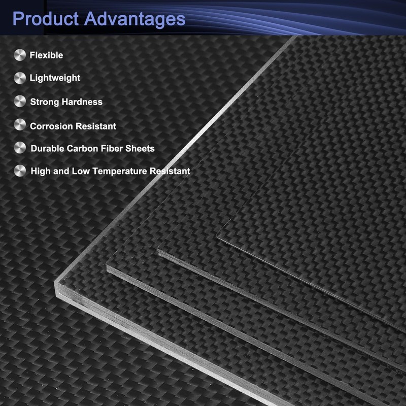 • DURABLE MATERIAL Strong hardness, lightweight, flexible, corrosion resistant, heat and cold resistant. SMOOTH EDGE Precise cutting, the edges of the carbon fiber sheets are smooth and burr-free.