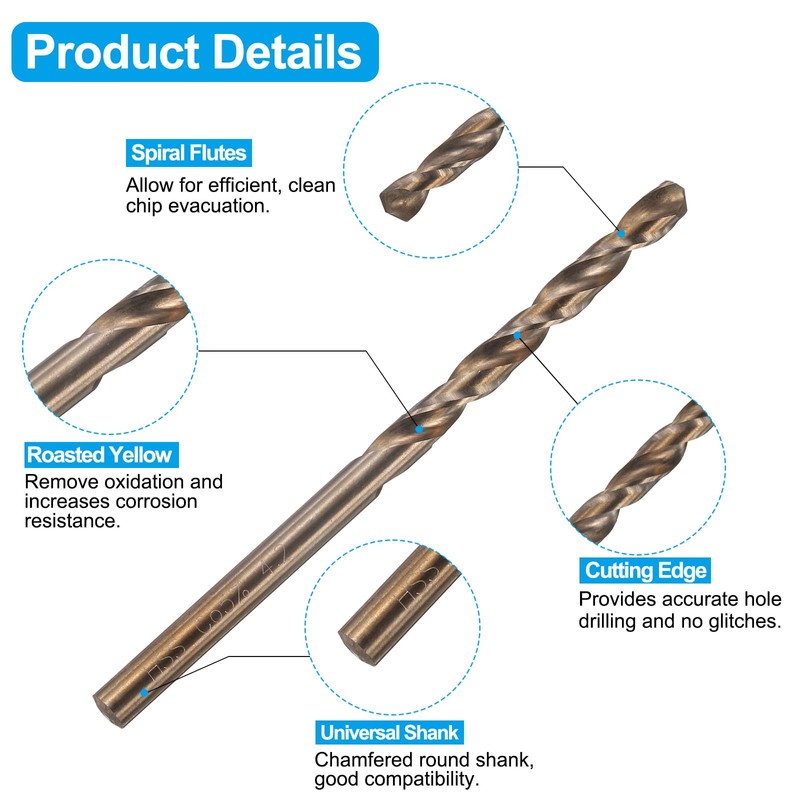 HSS-6542 (M2) thread cutter provides high hardness, good toughness, excellent wear and heat resistance for durability. The twist drill bit made of M35-HSS provides improved hardness, wear resistance and cutting performance as well as higher strength. The titanium coated thread cutter provides increased hardness, corrosion and rust resistance, heat resistance and reduces friction. The roasted yellow drill bit effectively removes oxidation on the metal surface and increases corrosion resistance.