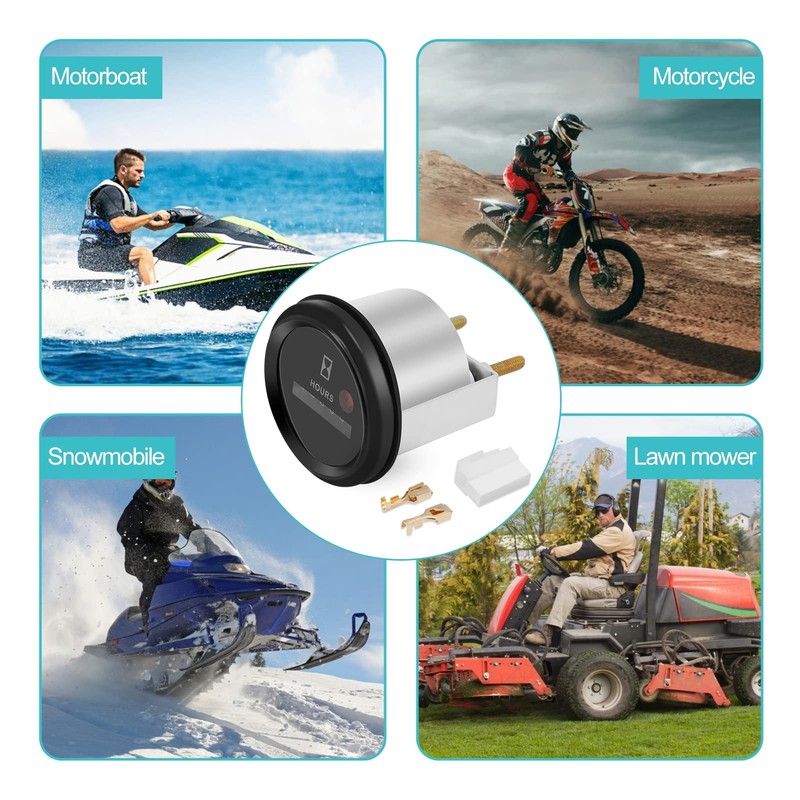 • Application: This hour meter is widely used for boats, automobiles, motorcycles, Snowmobile, Lawn Tractors, Wood Chippers, Shredders, Pumps, Generators, etc
