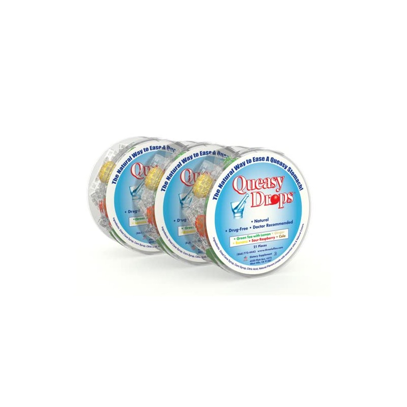 Queasy Drops | 3 Pack: 21 Drops Each | (Chemo, Motion Sickness, Hangover etc.) | Drug Free & Gluten Free | Five Flavors: Green Tea with Lemon, Ginger, Raspberry, Banana & Cola 21 Count