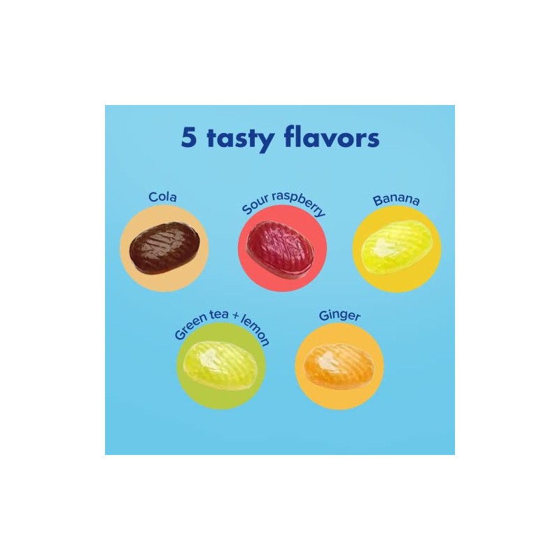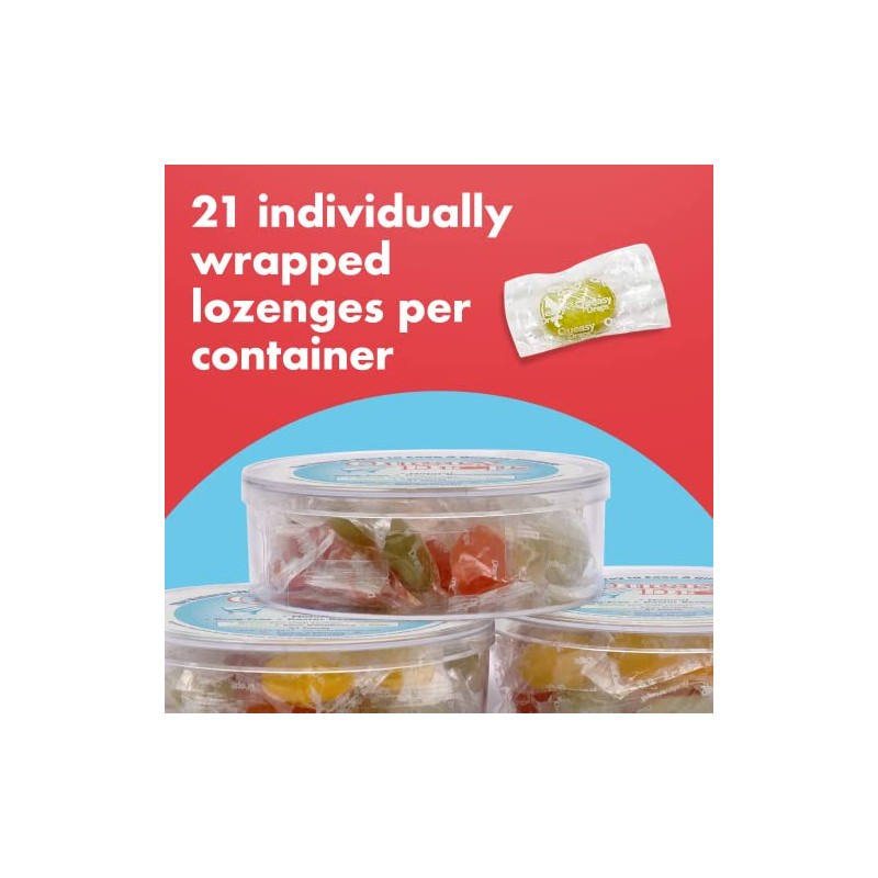 - Three (3) containers of our powerful lozenges; 21 lozenges per container; infused with nausea-relieving essential oils of sour raspberry, ginger, natural cola, banana and green tea with lemon