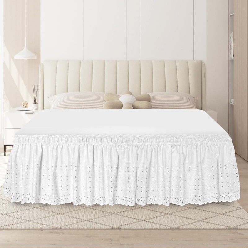 Queen Bed Skirt, Wrap-Around Elastic Ruffled Eyelet Bed Skirt Queen Size Dust Ruffle with Gathered Styling and Embroidered Details, 18" Drop Length (White)