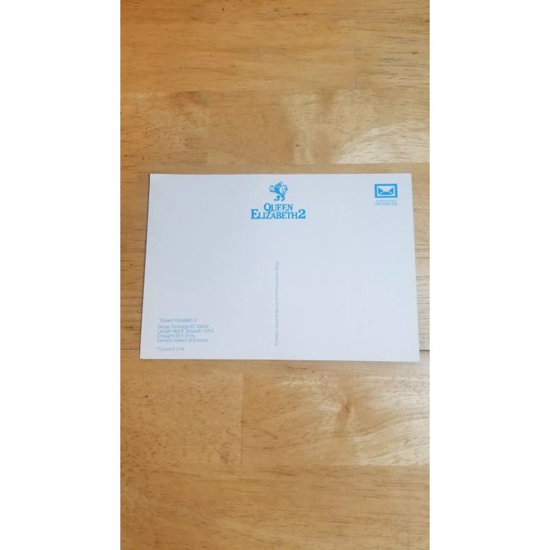 This vintage postcard features the iconic Queen Elizabeth 2 ocean liner from the Cunard Line, showcasing a real photo of the cruise ship. The postcard is a single unit and is an original, unposted piece from the 1980s. It is made of cardboard and measures 6 x 4 inches, following the continental size standard.