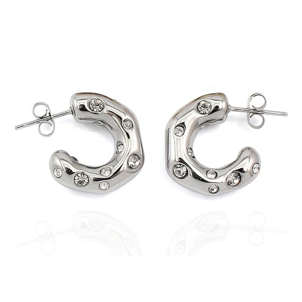 - DESIGN: Elegant semi-circular hoop earrings featuring a sleek silver-tone finish and scattered crystal embellishments for a modern, sophisticated look