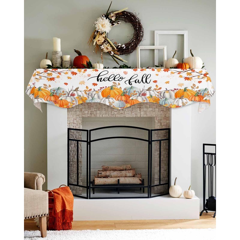 - HELLO FALL FIREPLACE DESIGN: Our mantel scarfs are printed with HELLO FALL, orange pumpkin, white pumpkin and maple leaves.The nice printing process makes the patterns on our fireplace scarves lively. Dressing up for Thanksgiving Day, it can create a pleasant atmosphere for the guests and you to celebrate the arrival of the holiday together