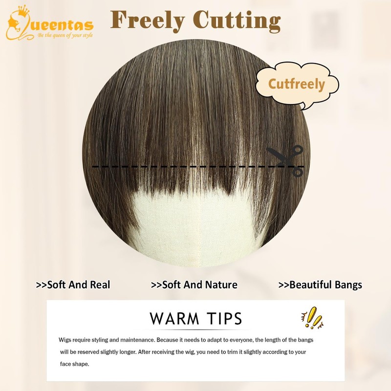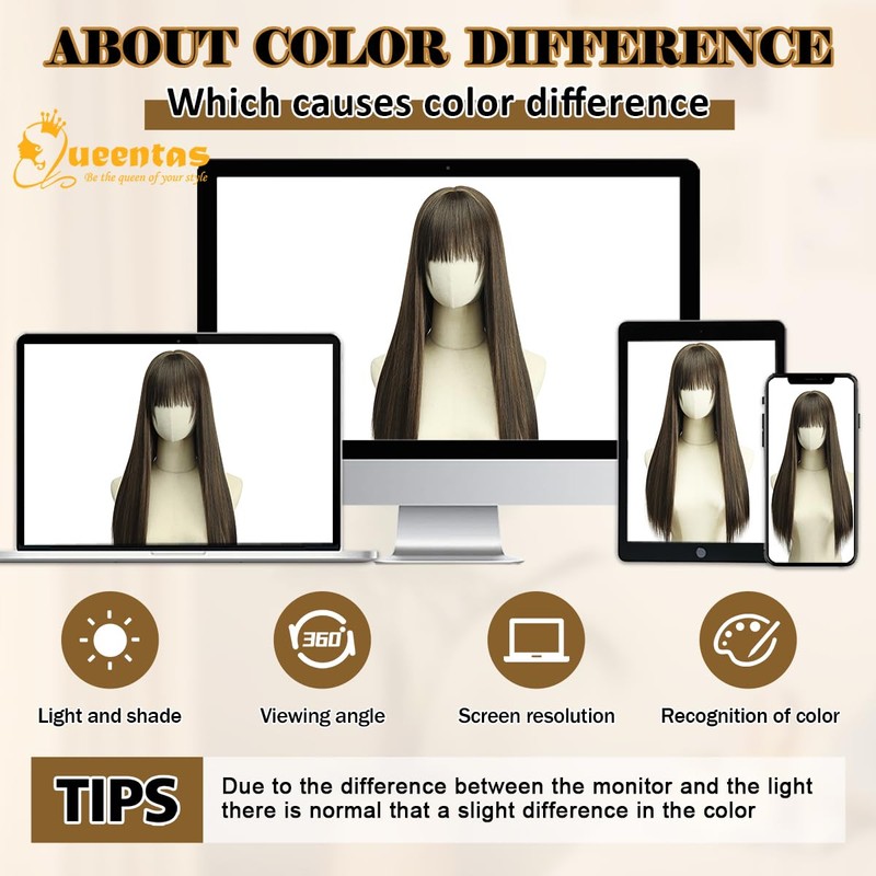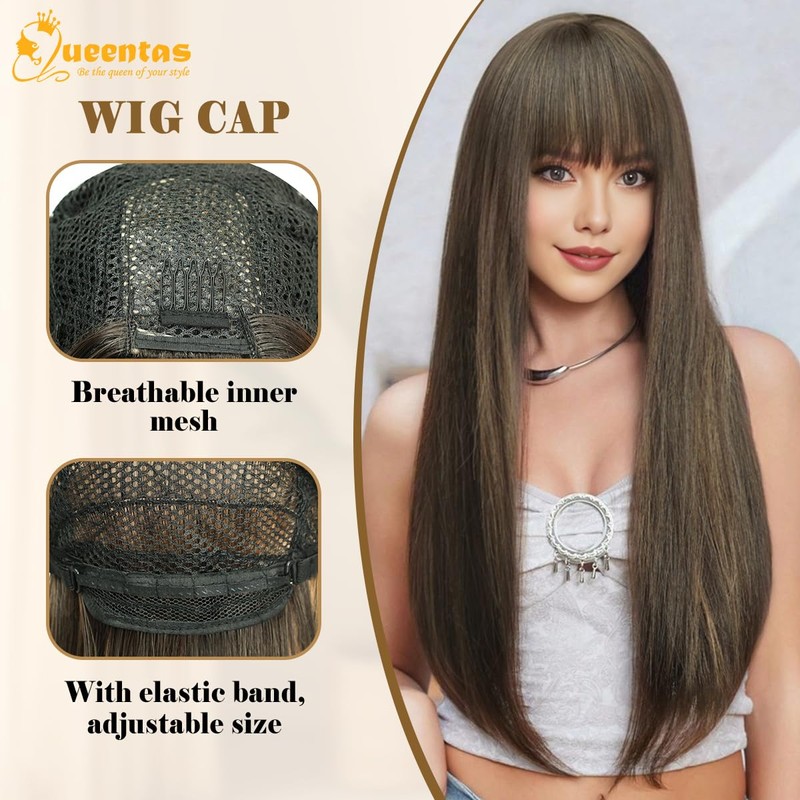 QUEENTAS Long Straight Brown with Highlight Wigs for Women Synthetic Heat Resistant Wigs with Fringe 24 Inch Daily Party Cosplay (Brown)