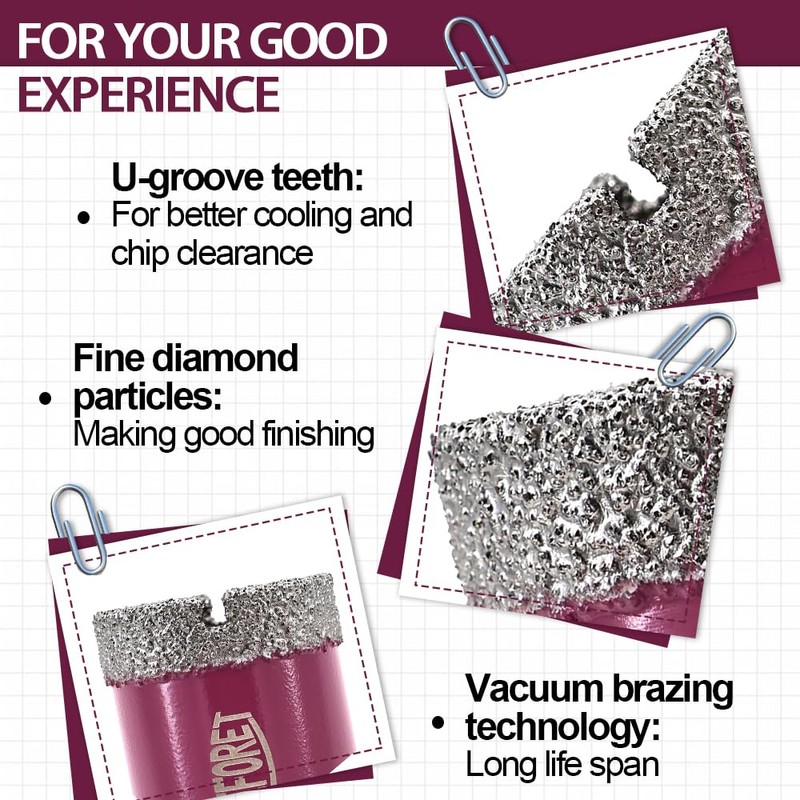 - Efficient and Endurable : With special U-groove teeth and chip holes, it greatly saves your time you spent spraying water and clearing the chips. Good finishing effect reduces unnecessary debris and damage, saving your material. Vacuum brazing technology and high quality diamonds increase drilling speed and enable a comparatively longer lifetime