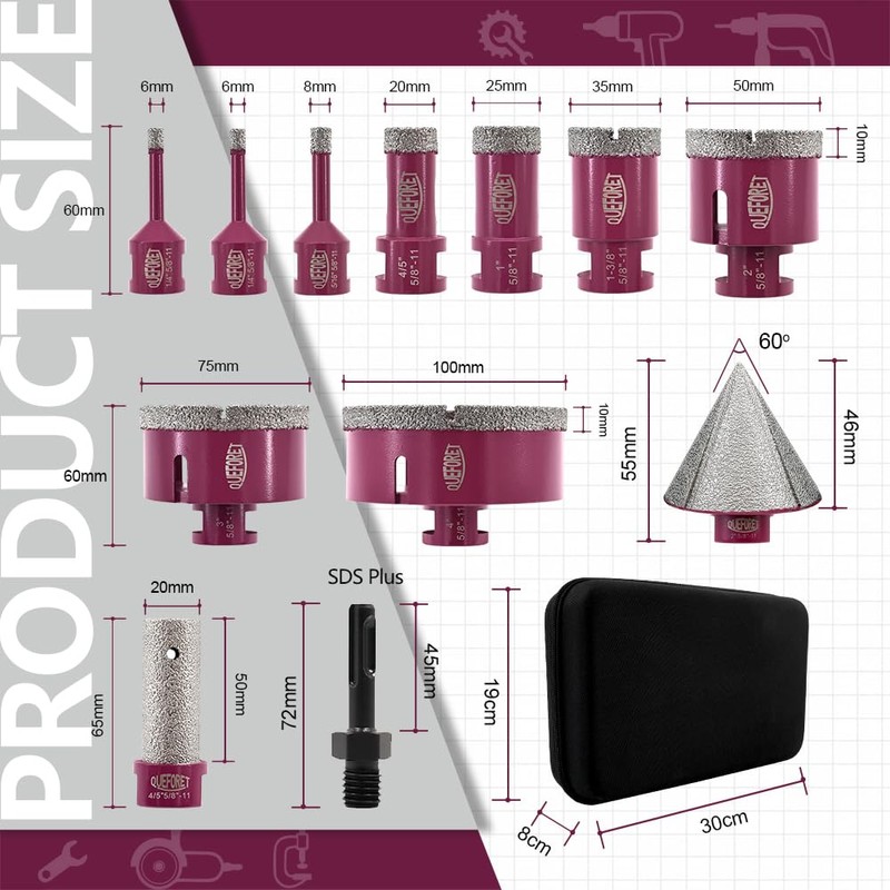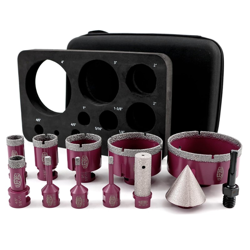 QUEFORET Diamond Drill Bits Set 12pcs - 9pcs 6/6/8/20/25/35/50/75/100mm Hole Saw, 20mm Finger Milling Bit, 50mm Beveling Chamfer Bit, 5/8-11 Thread, Adapter for Ceramic Porcelain Tile Marble Granite