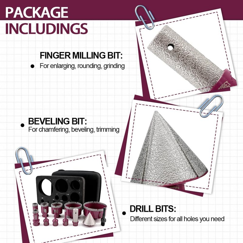 - Multi-functional : For various materials: ceramic porcelain tile, marble and granite, etc. Finger milling bit: for enlarging, rounding, grinding formed holes. Beveling bit: for chamfering, rounding, beveling, trimming and shaping formed holes. Dry or wet use