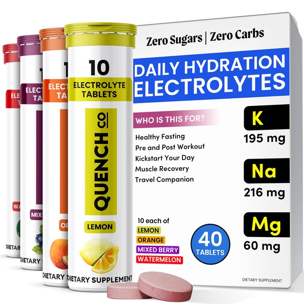 QUENCH COMPANY Quench Electrolyte Tablets 40 Count Instant Hydration, Electrolytes, Fasting Electrolytes No Sugar for Optimal Hydration Support Not Powder - Watermelon, Orange, Mixed Berry, Lemon Flavors