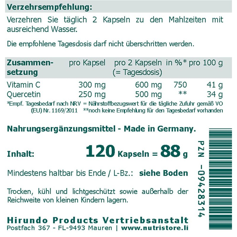 - Each vegan capsule contains 250 mg of vegetable quercetin of the best quality in combination with 300 mg vitamin C, which is available as a well-tolerated calcium ascorbate.