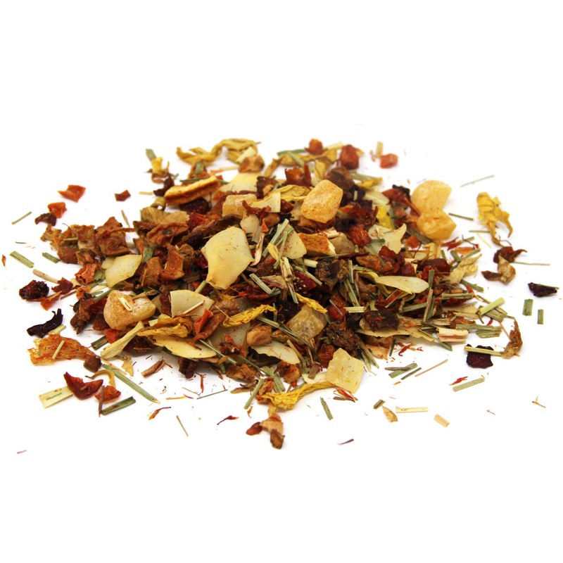 Ingredients: apple pieces, melon pieces (melon, sugar, acidifier: (citric acid), coconut chips (12%) (coconut, sugar), rose hip peels, carrot pieces, lemongrass, natural flavour, hibiscus flowers, orange corners, safflower flowers, beetroot pieces, multivitamin powder (carrier: maltodextrin, vitamin. CC, C, nicotinamid, Vitamin E, Panthothenic Acid, Vitamin B2, Vitamin B6, Vitamin B1, Folic Acid, Biotin, Vitamin B12), Sunflower Blossoms, Strawberry Pieces (0.5%), Natural Orange Flavour.