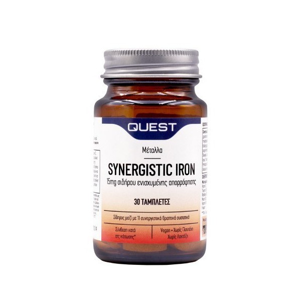 Quest Synergistic Iron provides iron, vitamin C, vitamins B2, niacin, B6, B12, pantothenic acid and folic acid which contribute to the reduction of tiredness and fatigue. Iron plays a role in the transport of vital oxygen around the body and in the formation of red blood cells. Quest Synergistic Iron provides a gentle form of iron combined with amino acids and additional nutrients to aid in its absorption and utilisation in the body.