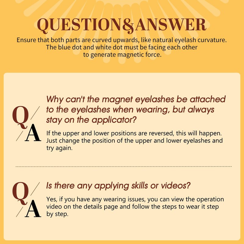 - Friendly for Beginners: Our magnetic eyelashes are equipped with magnetic applicator and instructions, you only need to follow the steps of the instructions. After taking out the eyelashes,gently separate them from the ends, find the small magnet on the eyelashes, and put the clip on the upper part of the eyelash is close to the root of the eyelash, then gently press it to close it, and suck the upper and lower eyelashes together to complete the wearing!