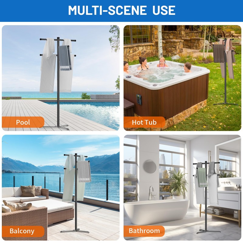 - Versatile & Multi-Functional: Standing 60 inches tall with 5 arms, this outdoor towel rack accommodates both adults and children. Ideal for drying towels, swimwear, goggles, and caps, it’s perfect for use in a variety of outdoor and indoor spaces, including as a towel drying rack by the pool or hot tub.