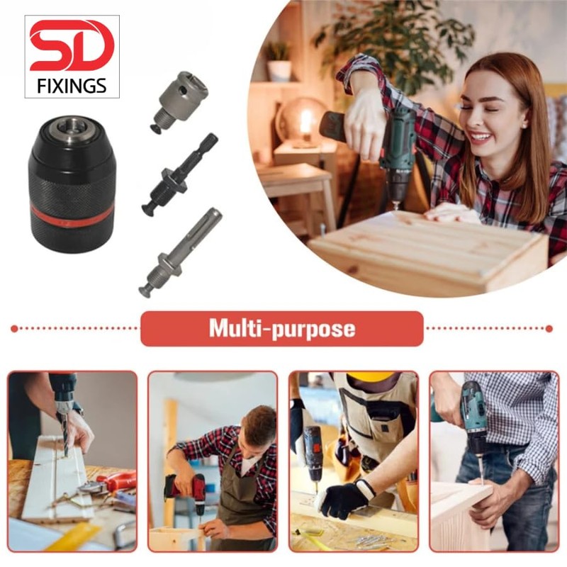 - VERSATILE CONVERSION: This adaptor kit allows quick conversion between 1/4" hex shank, SDS plus, and 1/2" square impact drill chucks for increased flexibility on job sites.