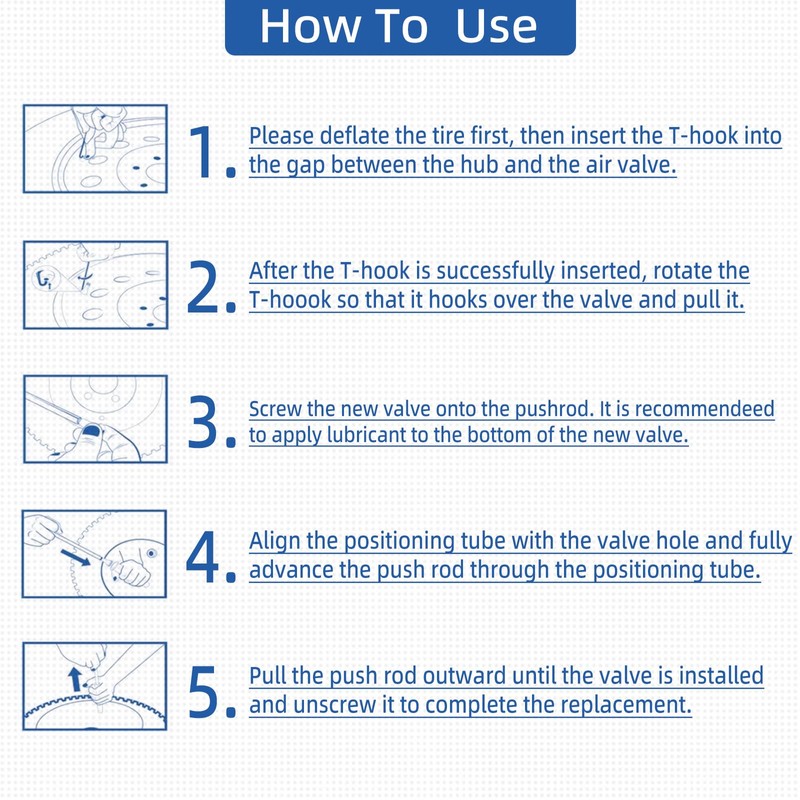 - 【Steps for usage】1.Deflate the tire; 2. Insert the T-shaped hook into the gap between the wheel hub and the valve core, rotate the hook to pull out the valve core; 3. Install the new valve core to the push rod; 4. Taper positioning The tube is aligned with the valve hole, and the push rod installs the valve core through the tapered positioning tube; 5. Rotate the push rod to disengage the valve core.