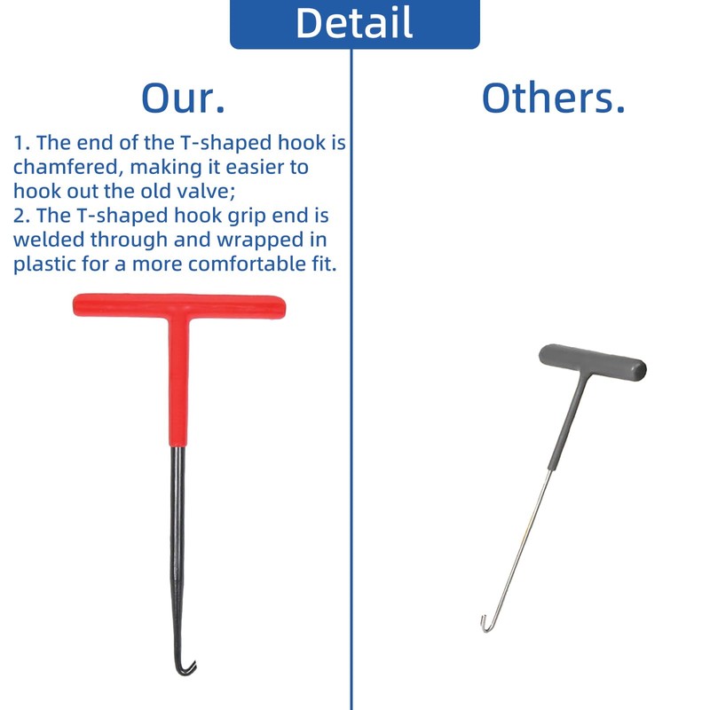 - 【Product Features】The T-shaped hook can quickly pull out the damaged valve core. The tapered positioning tube provides guidance and positioning when installing a new valve core. The metal push rod can accurately push the new valve core into the rim valve hole.