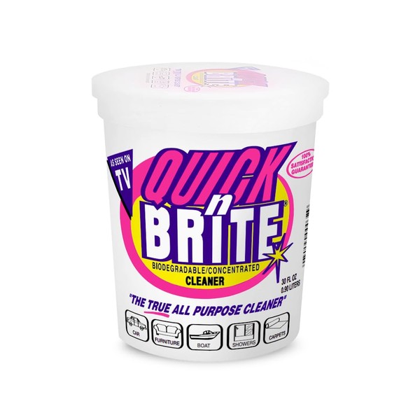 Quick N Brite All Purpose Cleaning Paste - 30 oz. is highly concentrated to give you the best cleaning power on the market. Try it to remove set in clothing stains, carpet stains, clean dirty showers - even fireplace soot! Use it full strength (right out of the container), or diluted to replace your household cleaning products like Window Cleaners, Daily Shower Sprays and All- Purpose Kitchen Cleaners. Quick N Brite is an environmentally safe all-purpose cleaner that has the power to make your toughest cleaning jobs a breeze! Eliminates the need for other household cleaners. It works instantly to erase dirty shower grime, deep clothing stains, grease build up on stoves, kitchen floors, and even leather sofas. Best of all, Quick N Brite is safe to use around your kids, pets and food, because it's 100 percent non-toxic and biodegradable. Give your auto tires and wheels that showroom look and effortlessly remove road grime, brake dust and dirt from your custom wheels. Dirt, grime and stains will disappear from carpet with the powerful action of Quick N Brite - no matter how long the stain has been there. Don't throw that shirt or blouse away - rub Quick N Brite full strength on the spot and completely remove stains! It even takes out set in stains - no matter how long they've been there. Recover the splendor of your hardwood, tile or vinyl floors with Quick N Brite. Easily remove years of dirt and grease with one simple cleaning. Quick N Brite has been pioneering the way in environmentally safe cleaners for over 56 years. The unique blends of non-toxic and biodegradable ingredients are eco-friendly, yet strong enough for the worst stains and messes. Quick N Brite works so well it was recommended by Better Homes & Gardens as an "all-time favorite." And remember, we always have a 100 percent satisfaction guarantee for as long as you own the product!