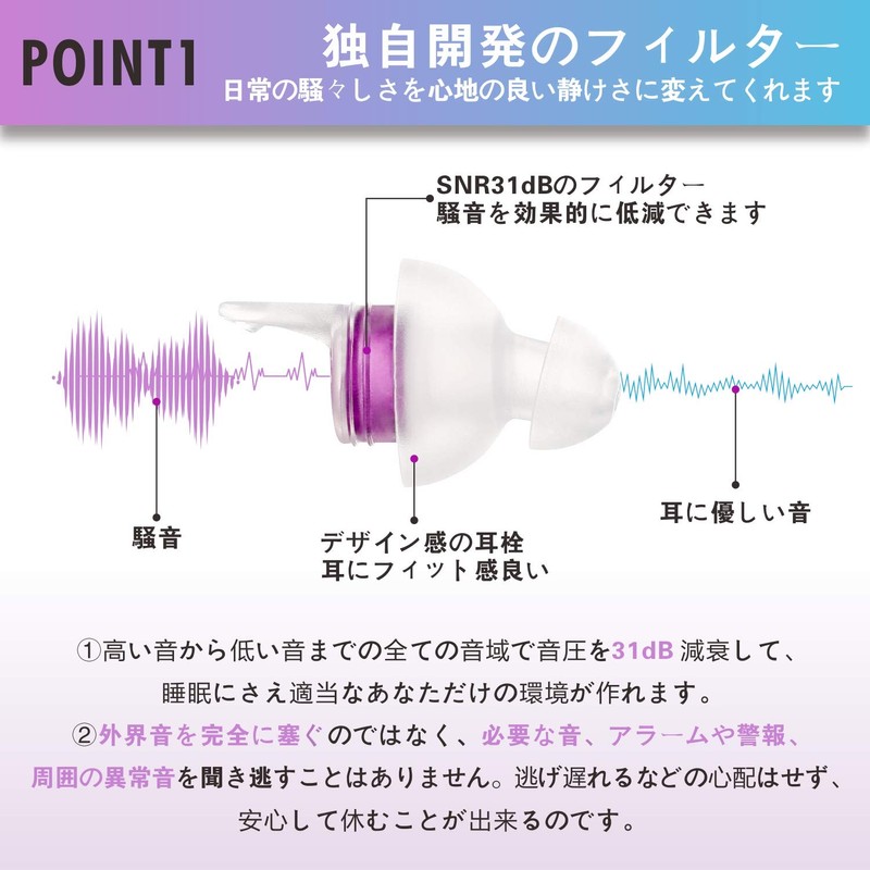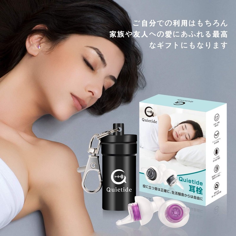 - Proprietary filters effectively block unwanted noise: Normal conversation is about 50 dB - 60 dB (decibel), and it is said that noise levels of less than 40 dB are desirable for sleep.Quietide earplugs are equipped with proprietary filters, allowing you to adjust the volume of ambient noise so you can create a suitable environment even for sleep.Instead of completely blocking outside noise, sound pressure is dampened by 31 dB in the entire range from high to low sound.Never miss hearing any necessary noise, alarms, or ambient abnormalities.You can rest with confidence knowing that you don't have to worry about being delayed from escaping during disasters, etc.