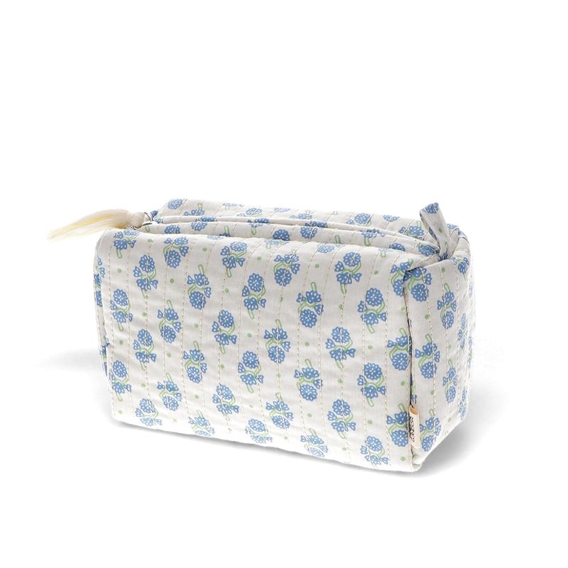 - A stylish and practical makeup bag featuring a quilted texture and a charming Cornflower print.