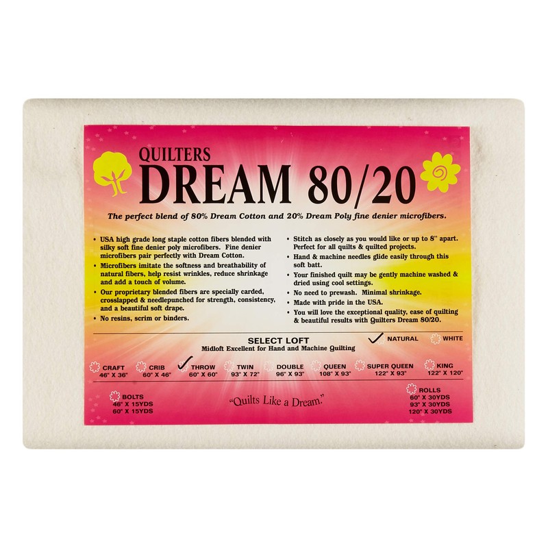 Quilters Dream 80/20 the perfect blend of 80% high grade long staple USA cotton fiber paired with 20% fine denier poly microfiber for a soft silky batting that drapes beautifully and breathes well. The long staple cotton fiber reduces shrinkage and adds stability so that the stitches can be up to 8 apart. The poly micro fibers add loft and resistance to creases/wrinkles. Our proprietary blended fibers are specially carded cross-lapped and needle- punched for strength consistency and a beautiful soft drape. There are no scrims glues or other binders to resist the needle so this fine batting can be hand or machine quilted with ease.