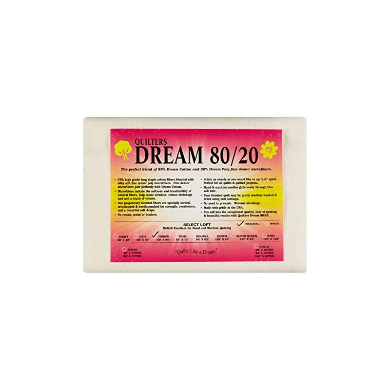 • Quilters Dream 80/20 the perfect blend of 80% high grade long staple USA cotton fiber paired with 20% fine denier poly microfiber for a soft silky batting that drapes beautifully and breathes well. The long staple cotton fiber reduces shrinkage and adds stability so that the stitches can be up to 8 apart. The poly micro fibers add loft and resistance to creases/wrinkles. Our proprietary blended fibers are specially carded cross-lapped and needle-punched for strength. . .