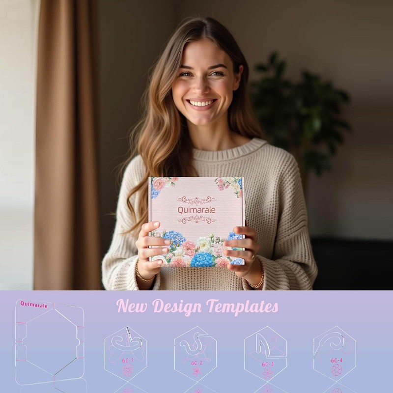 Quimarale 4 Pieces Free Motion Quilting Rulers and Templates with 1 Pieces Quilting Frame Acrylic Quilting Supplies Hexagon Quilting Templates for Machine Quilting with Instruction (6C Design)