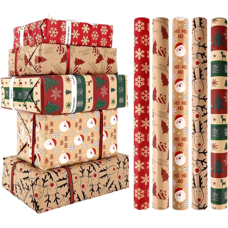 - Package: 5 rolls of Christmas gift wrapping paper with 5 classic Christmas design in red, white, black with natural Kraft classic color. Ideal for parcel, presents boxes and Christmas gifts wrapping decorations
