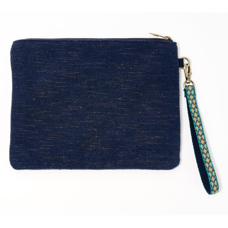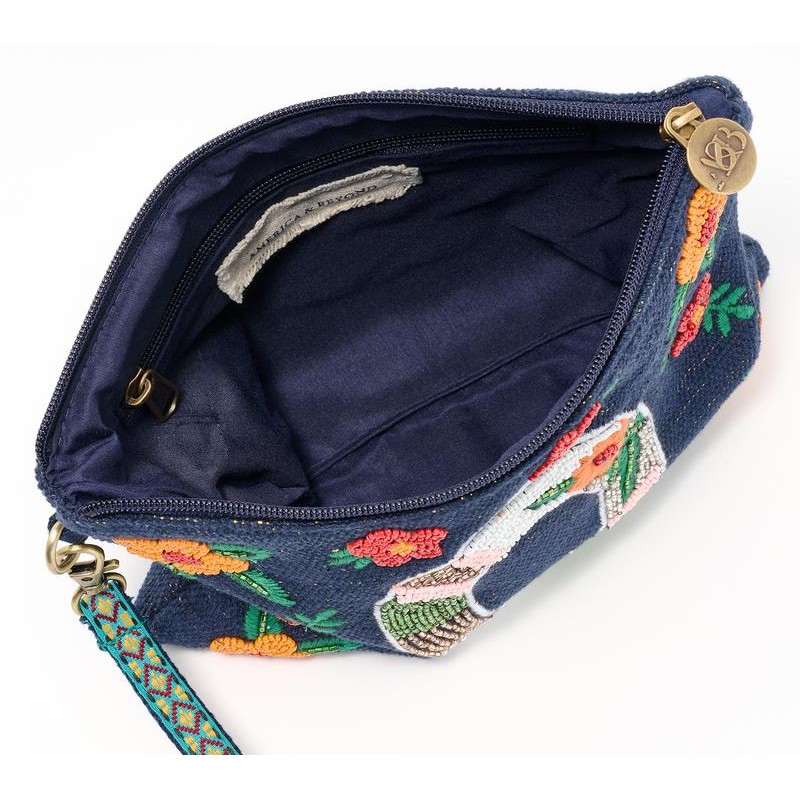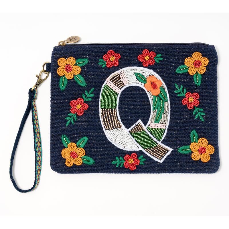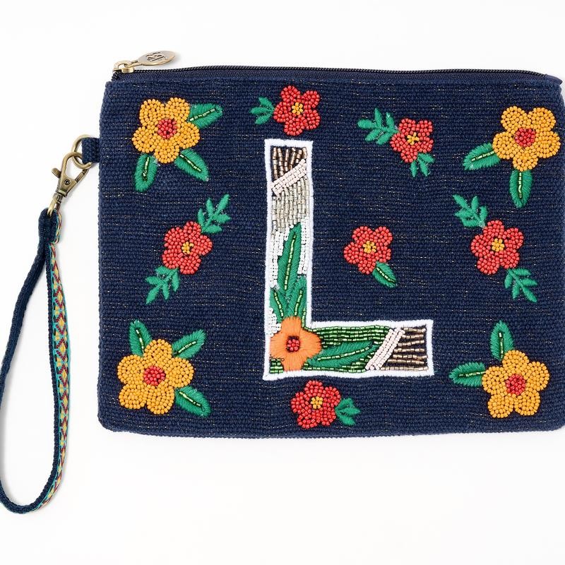 • Handcrafted, front initial design, bead embellishments, zip-top closure, removable wristlet strap