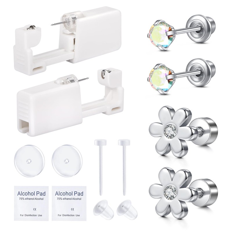 - Ear piercing gun kit include - 1pair ear piercing gun with earrings + 1pair flat back small flower earring studs + 2pcs clean pad + 1pair clear earrings stud + 1pair no pull piercing disc