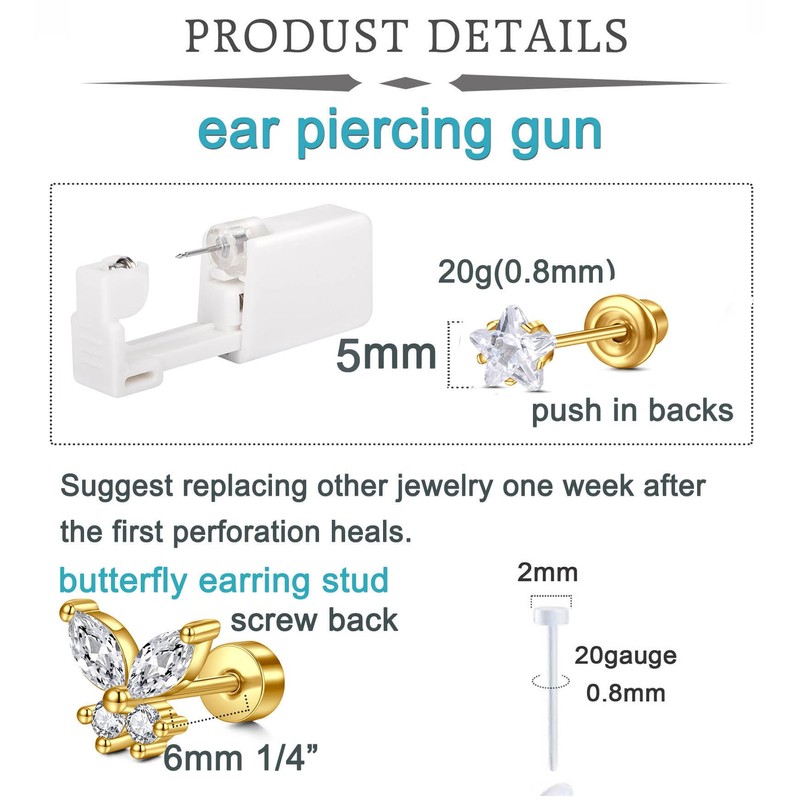 - Ear piercing gun kit include - 1pair ear piercing gun with earrings + 1pcs ear piercing gun aid + 1pair flat back butterfly earring studs + 2pcs clean pad + 2pair clear earrings stud + 10pcs Waterproof earmuffs
