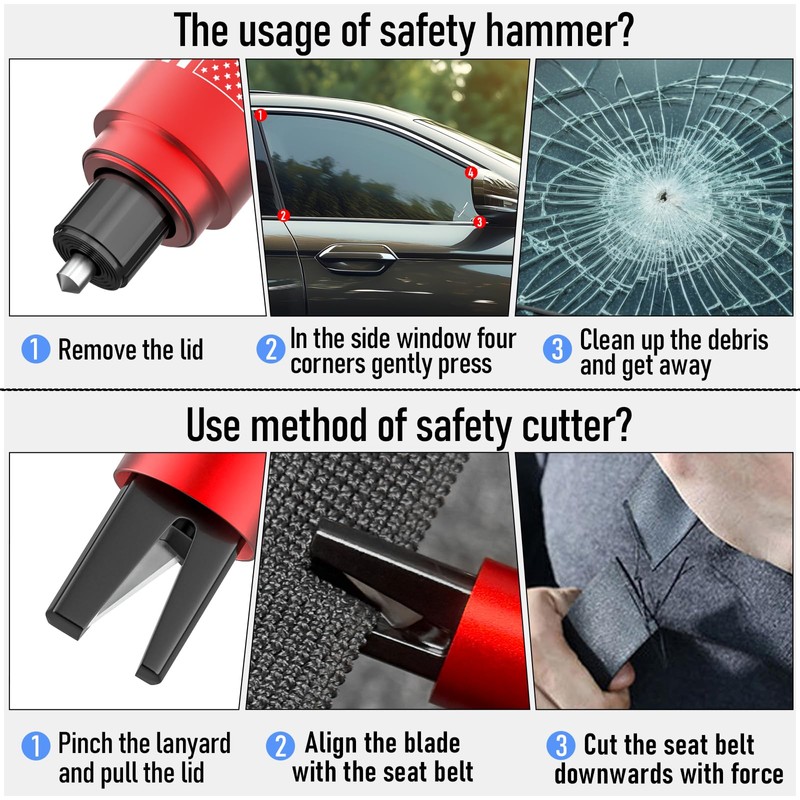 - Fashionable & Portable, Easy to Place: Each safety hammer comes with a base and hanging rope, elegant American flag pattern can make the safety hammer a decoration in your car. The shell is made of aluminum alloy, which can withstand high and low temperatures, compact design makes it easily accessible in the car and can be used to rescue yourself or others in emergency situations.