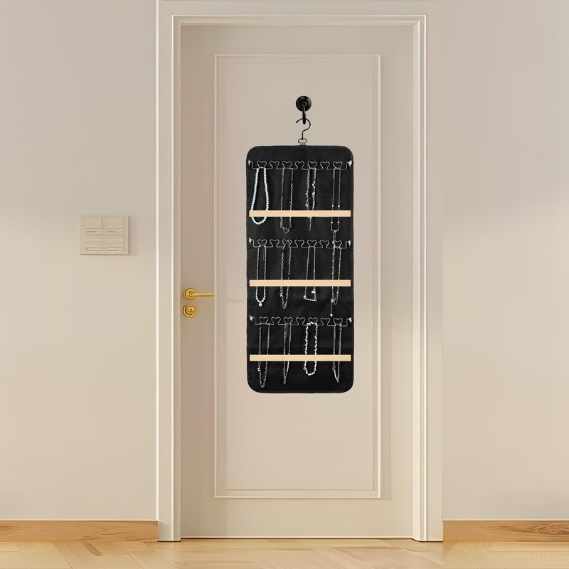 QWORK® 1 stück schmuckaufbewahrung, doppelseitiger halsketten-organizer zum aufhängen, mit staubdichten taschen und haken, zum ordnen von schmuck, kosmetik und accessoires