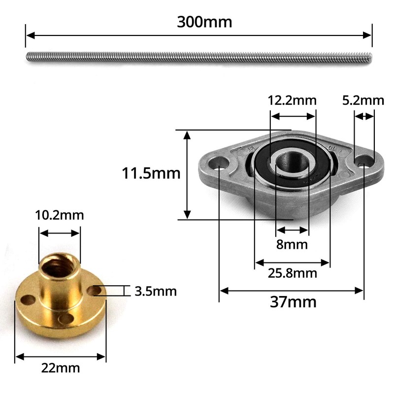 Feature: Made of high quality stainless steel, this lead screw is rust and corrosion resistant, durable and sturdy. With 4 holes on the T8 brass nut, it can be easily attached to the machine. Package Content 2 x 300mm 8mm Lead Screw 2 x Nuts 2 x Coupler 4 x Pillow Block Bearings 2 x Hex Wrench
