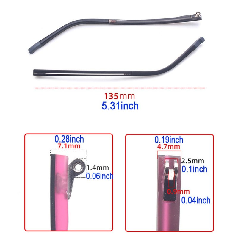 - · Size: Glasses temple width: 4.7mm, Hinge spacing thickness:0.9mm, hinge depth: 7.1 mm, Please kindly check the size detail before order.
