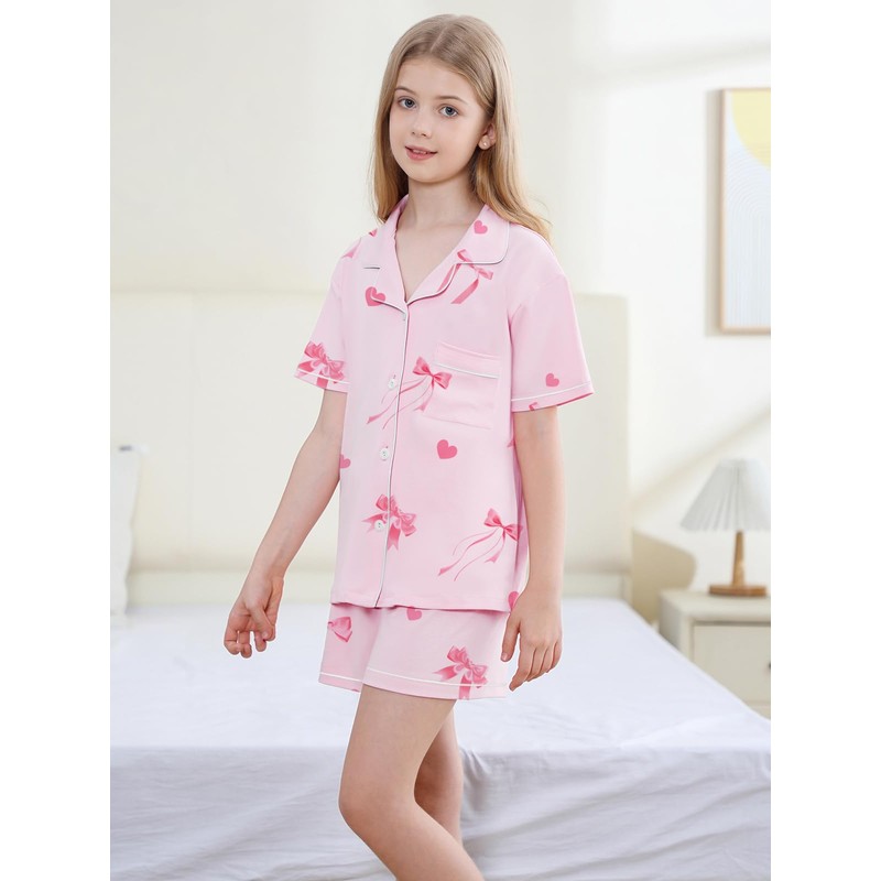 QZH.DUAO 100% Cotton Girls' Pajama Set with Button-Up Short Sleeve Sleepwear Nightwear Loungewear for girl, Pink Bow, 13-14 Years