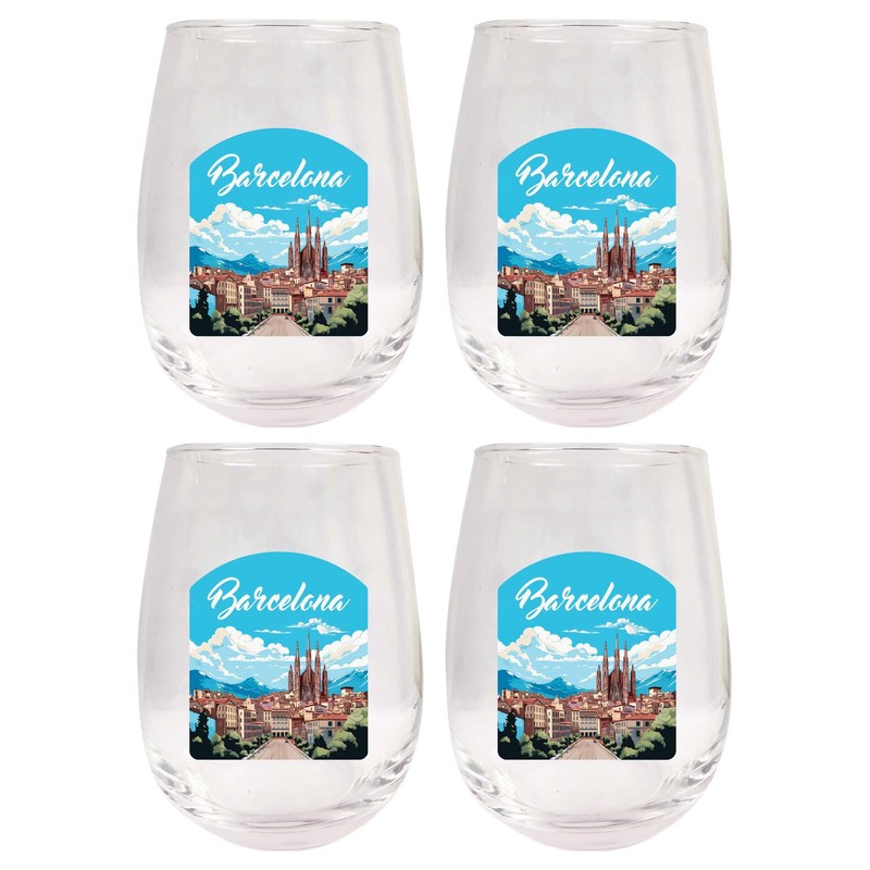 R and R Imports Barcelona Spain Design A Souvenir 15 oz Stemless Wine Glass 4-Pack