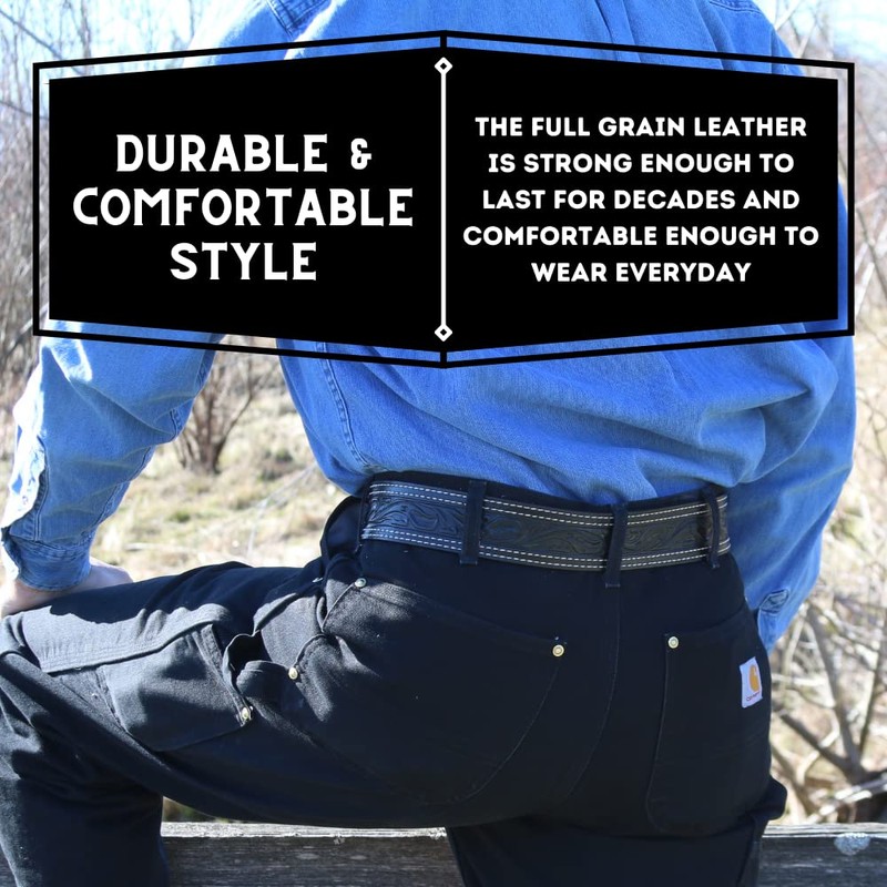 - BEST BELTS EVER - The 4552 comes with a black gloss finish. It is a wider belt with light natural thread accent stitching with a country western embossed styling.